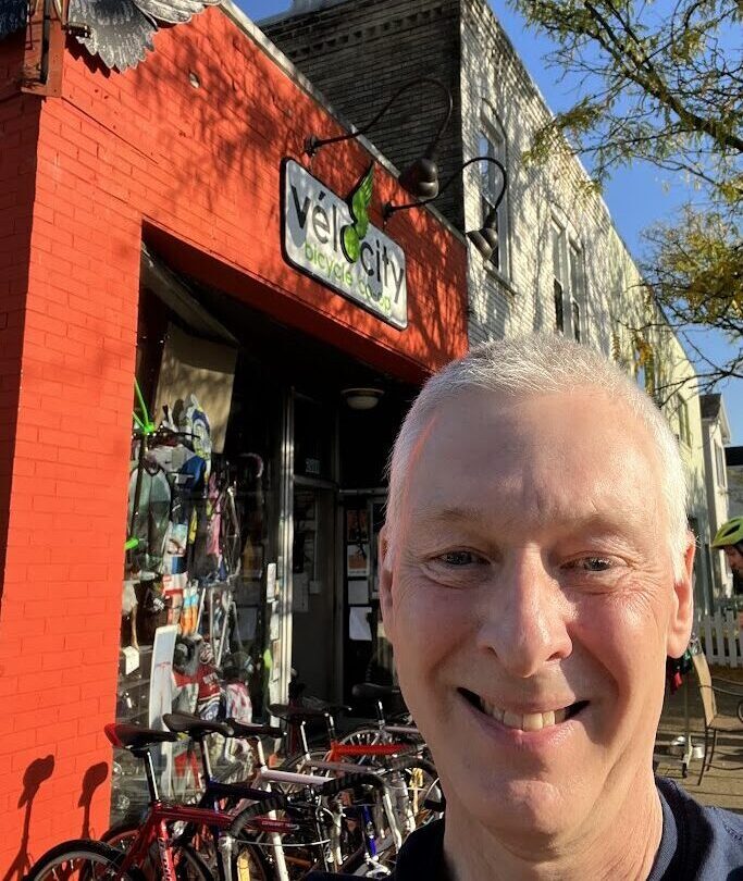Pete Peters began training as a bicycle mechanic at Vélocity’s Arlington location in 2025, after over two decades in the military. Gym restrictions during COVID gave him a reason to get out his old mountain bike and he rediscovered a passion for riding. He enjoys spending time outside, rooting for animals, and restoring antique tools.
