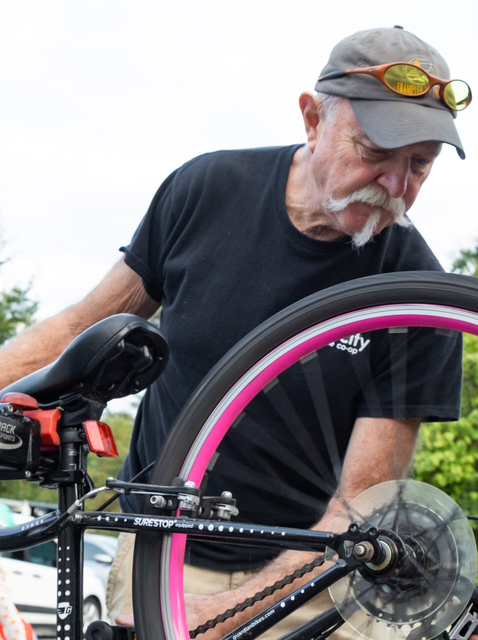 Steve Walz has been biking since hauling newspapers in the front basket of his balloon tire Schwinn Tornado as a youth. He learned basic maintenance and repair during his college years from the owner of a one-person shop, Fuji Cycles of Worcester. Since then, Steve has seen the strength of community and came to volunteer at Vélocity to give back and both learn from, and spend time with, fellow bike people. When the Véloteer urge calls you, Steve looks forward to meeting you and seeing you around the Vélocity shops and warehouse!
